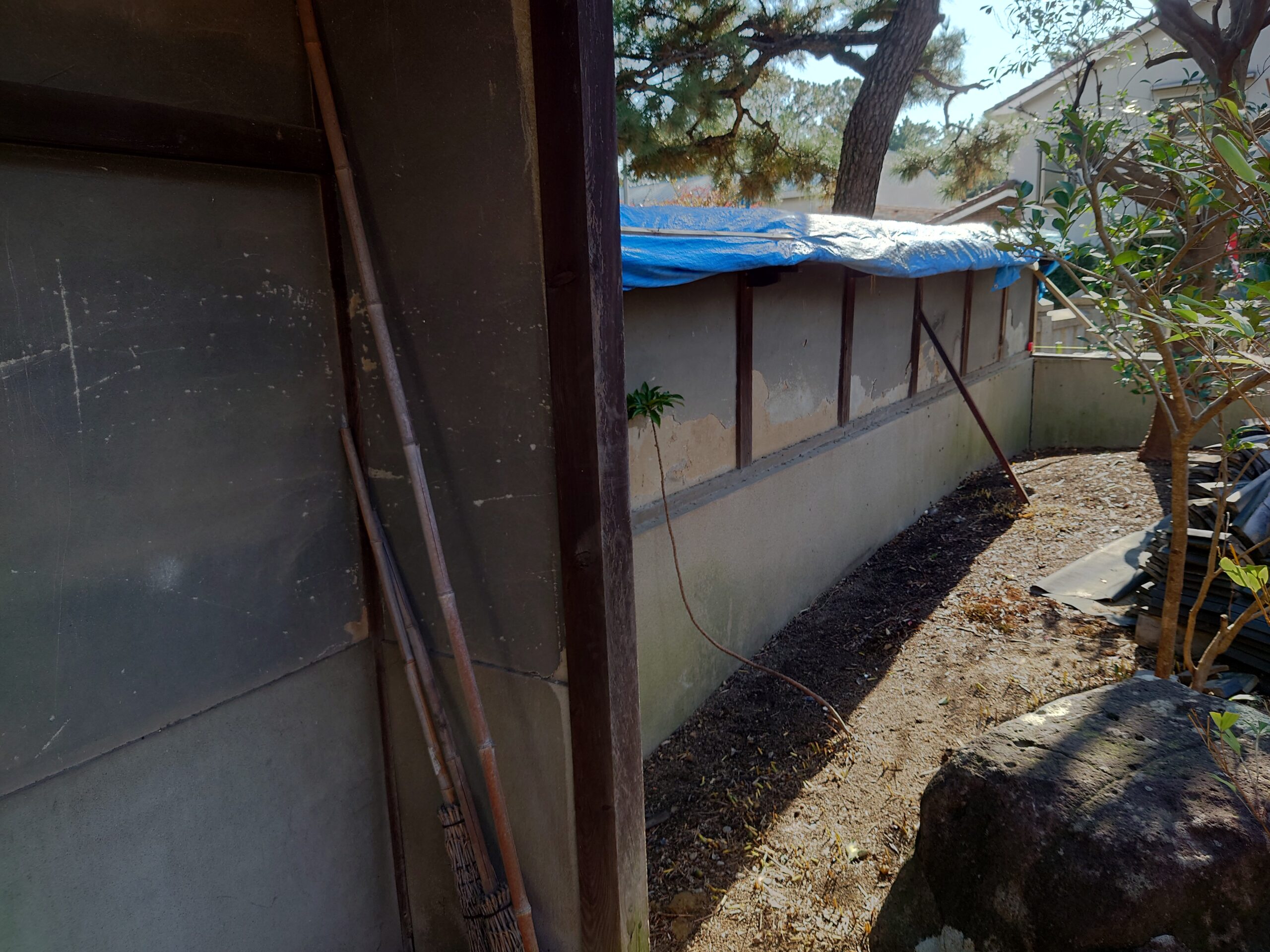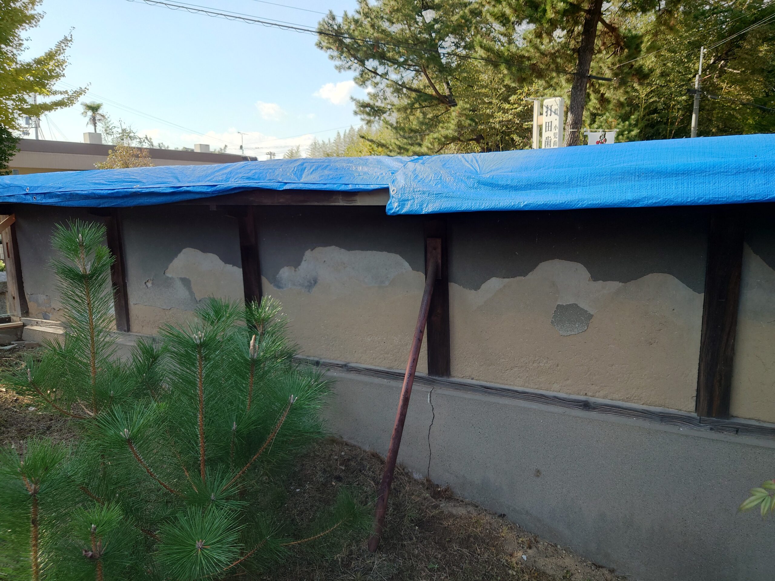加古川市にある神社の塀を漆喰に塗り替える左官工事が始まりました。